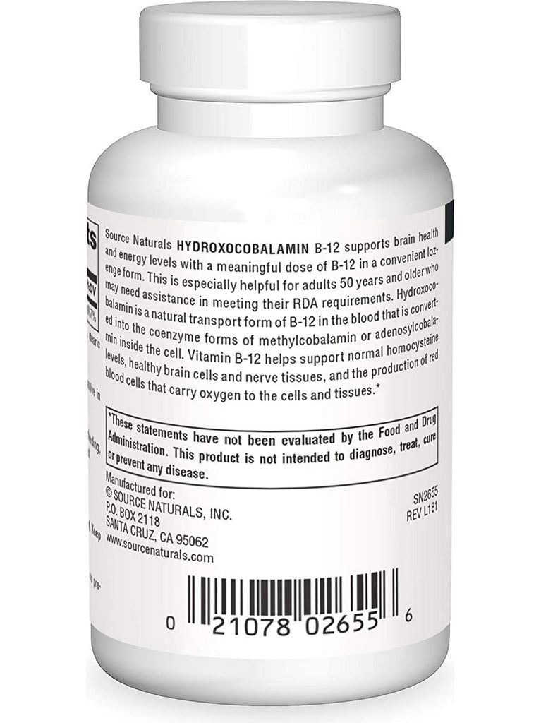 Source Naturals Hydroxocobalamin B-12 supports brain health and energy levels with a meaningful dose of B-12 in a convenient lozenge form. This is especially helpful for adults 50 years and older who may need assistance in meeting their RDA requirements. Hydroxocobalamin is a natural transport form of B-12 in the blood that is converted into the coenzyme forms of methylcobalamin or adenosylcobalamin inside the cell. Vitamin B-12 helps support normal homocysteine levels, healthy brain cells and nerve tissues, and the production of red blood cells that carry oxygen to the cells and tissues.