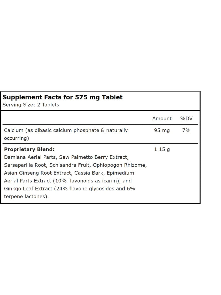 Proprietary Blend: Saw Palmetto Berry Extract, Sarsaparilla Root, Damiana Aerial Parts, Schisandra Fruit, Ophiopogon Rhizome, Asian Ginseng Root Extract, Cassia Bark, Epi Aerial Parts Extract (10% flavonoids as icariin), and Ginkgo Leaf Extract (24% flavone glycosides and 6% terpene lactones). - 1.15 g