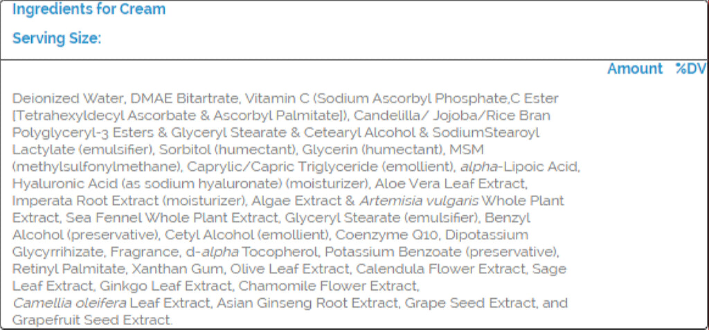 Deionized Water, DMAE Bitartrate, Vitamin C (Sodium Ascorbyl Phosphate, C-Ester [Tetrahexyldecyl Ascorbate and Ascorbyl Palmitate]), Candelilla/Jojoba/ Rice Bran Polyglyceryl-3 Esters and Glyceryl Stearate and Cetearyl Alcohol and Sodium Stearoyl Lactylate (emulsifier), Sorb. (humectant). Glycerin (humectant), MSM, Caprylic/Capric Triglyceride (emollient), alpha-Lipoic Acid, Hyaluronic Acid(moisturizer), Aloe Vera Leaf Extract, Imperata Root Extract and PEG-8 and Carbomer (moisturizer), Algae Extract and Artemisia vulgaris Whole Plant Extract, Sea Fennel Whole Plant Extract, Glyceryl Stearate (emulsifier), Benzyl Alcohol (preservative), Cetyl Alcohol (emollient), Coenzyme Q10, Licorice Root, Fragrance, D-alpha Tocopherol, Potassium Benzoate (preservative), Retinyl Palmitate, Xanthan Gum, Olive Leaf Extract, Calendula Flower Extract, Sage Leaf Extract, Ginkgo Leaf Extract, Chamomile Flower Extract, Camellia oleifera Leaf Extract, Asian Ginseng Root Extract, Grape Seed Extract, and Grapefruit Seed Extract. -