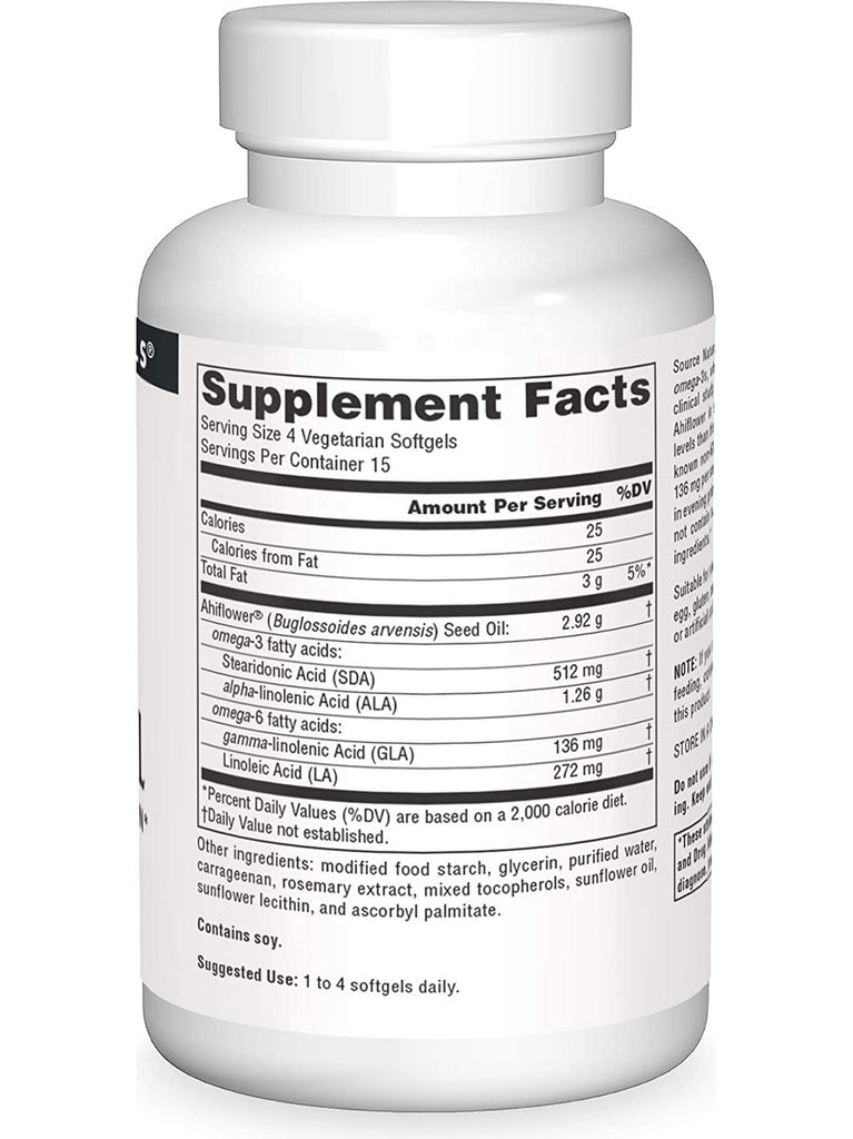 Source Naturals Ahiflower® Oil is a unique source of omega-3s, which are important for heart and brain health. A clinical study showed that the SDA omega-3 fatty acid in Ahiflower is significantly more efficient in increasing EPA levels than the fatty acid in flaxseed. Ahiflower is the highest known non-GMO source of SDA. This product also contains 136 mg per serving of the same beneficial omega-6 GLA found in evening primrose oil. Source Naturals Ahiflower Oil does not contain any fish or animal products, or animal-derived ingredients.