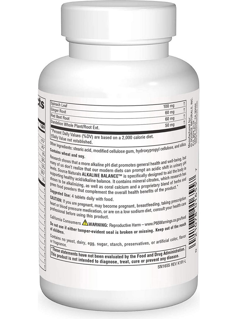 Research shows that a more alkaline pH diet promotes general health and well-being, but many of us don't realize that our modern diets can prompt an acidic shift in urinary pH levels. Source Naturals Alkaline Balance™ is specifically designed to aid the body in supporting healthy acid/alkaline balance. It contains mineral citrates, which research has shown to be alkalinizing, as well as coral calcium and a proprietary blend of herbs and green food powders that complement the overall health benefits of the product.