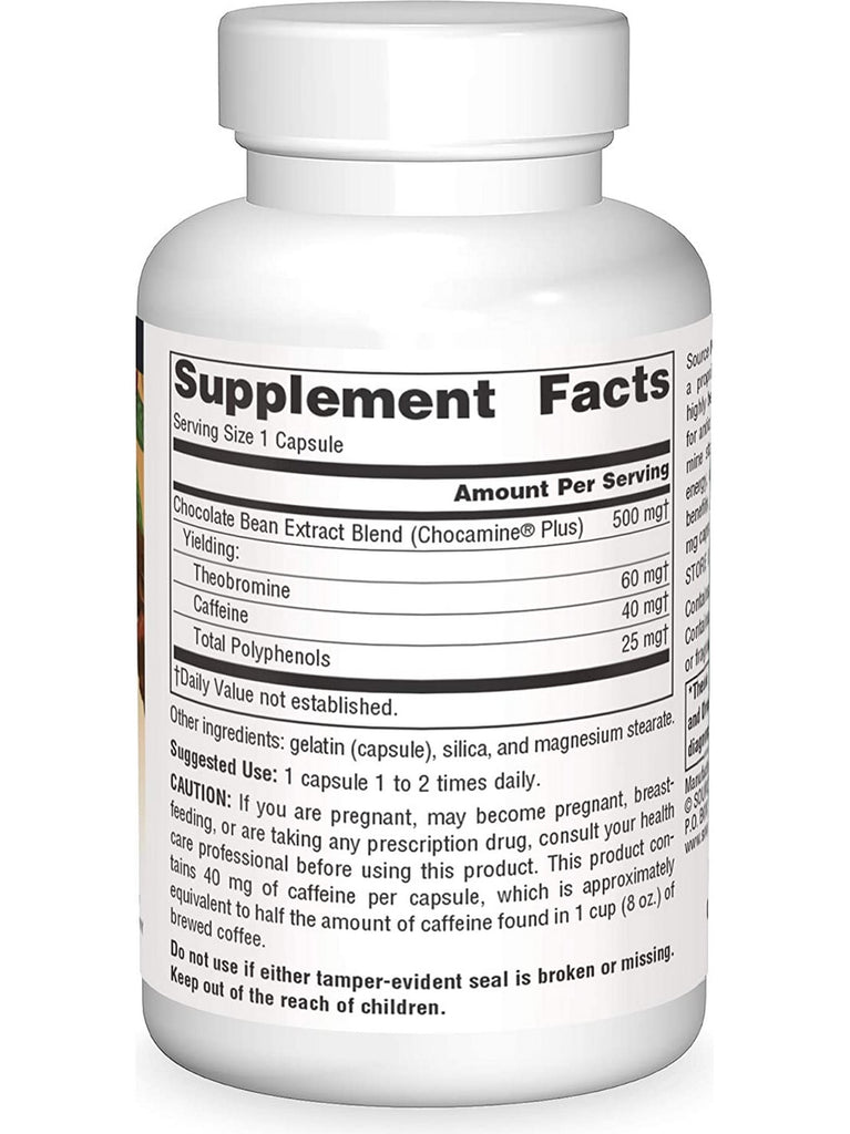 Source Naturals CHOCOLIFT™ contains Chocamine® Plus, a proprietary cocoa extract blend. Chocamine contains highly beneficial polyphenol flavonoids, standardized to 5% for antioxidant defense. CHOCOLIFT also contains theobromine standardized to 12% for the support of increased energy, mental acuity and cognitive function. The positive benefits of chocolate are now available in a convenient 500 mg capsule from Source Naturals.