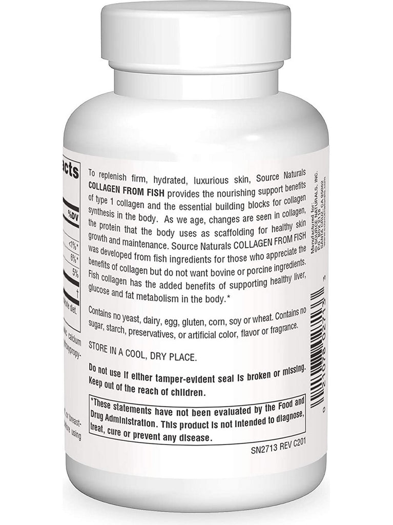 To replenish firm, hydrated, luxurious skin, Source Naturals Collagen From Fish provides the nourishing support benefits of type 1 collagen and the essential building blocks for collagen synthesis in the body. As we age, changes are seen in collagen, the protein that the body uses as scaffolding for healthy skin growth and maintenance. Source Naturals Collagen From Fish was developed from fish ingredients for those who appreciate the benefits of collagen but do not want bovine or porcine ingredients. Fish collagen has the added benefits of supporting healthy liver, glucose and fat metabolism in the body.
