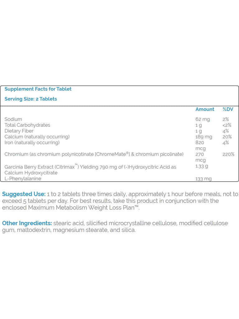 1 to 2 tablets three times daily, approximately 1 hour before meals, not to exceed 5 tablets per day. For best results, take this product in conjunction with the enclosed Maximum Metabolism Weight Loss Plan™.