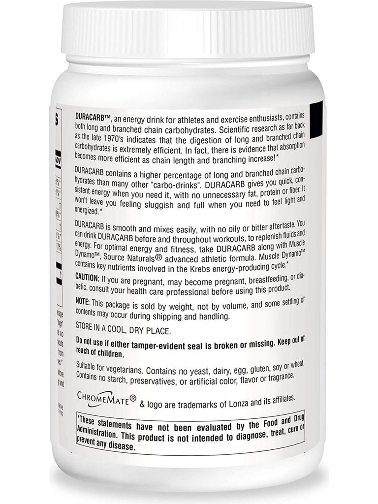 DuraCarb is smooth and mixes easily, with no oily or bitter aftertaste. You can drink DuraCarb before and throughout workouts, to replenish fluids or energy. For optimal energy and fitness, take DuraCarb along with Muscle Dynamo™, Source Naturals® advanced athletic formula. Muscle Dynamo contains vitamin B and other nutrients involved in the Krebs energy-producing cycle.