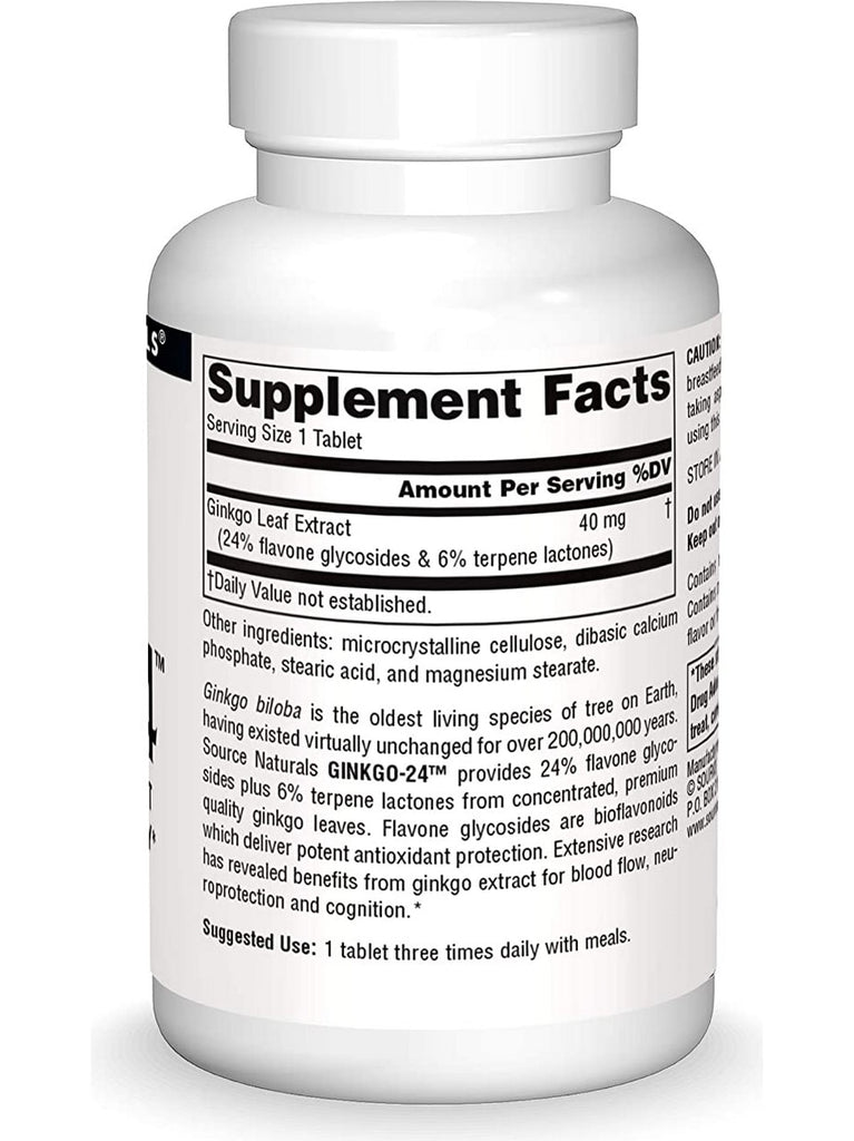 Ginkgo biloba is the oldest living species of tree on Earth, having existed virtually unchanged for over 200,000,000 years. Source Naturals Ginkgo-24™ provides 24% flavone glycosides plus 6% terpene lactones from concentrated, premium quality ginkgo leaves. Flavone glycosides are bioflavonoids which deliver potent antioxidant protection. Extensive research has revealed benefits from ginkgo extract for blood flow, neuroprotection and cognition.