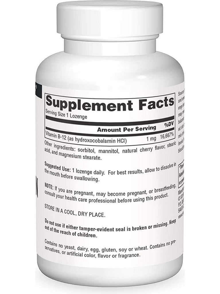 Source Naturals Hydroxocobalamin B-12 supports brain health and energy levels with a meaningful dose of B-12 in a convenient lozenge form. This is especially helpful for adults 50 years and older who may need assistance in meeting their RDA requirements. Hydroxocobalamin is a natural transport form of B-12 in the blood that is converted into the coenzyme forms of methylcobalamin or adenosylcobalamin inside the cell. Vitamin B-12 helps support normal homocysteine levels, healthy brain cells and nerve tissues, and the production of red blood cells that carry oxygen to the cells and tissues.