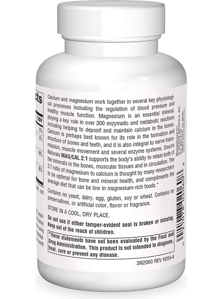 Calcium and magnesium work together in several key physiological processes including the regulation of blood pressure and healthy muscle function. Magnesium is an essential mineral, playing a key role in over 300 enzymatic and metabolic reactions including helping to deposit and maintain calcium in the bones. Calcium is perhaps best known for its role in the formation and structure of bones and teeth, and it is also integral to nerve transmission, muscle movement and several enzyme systems. Source Naturals Mag/Cal 2:1 supports the body's ability to retain both of the minerals in the bones, muscular tissues and in circulation. The 2:1 ratio of magnesium to calcium is thought by many researchers to be optimal for bone and mineral health, and complements the average diet that can be low in magnesium-rich foods.
