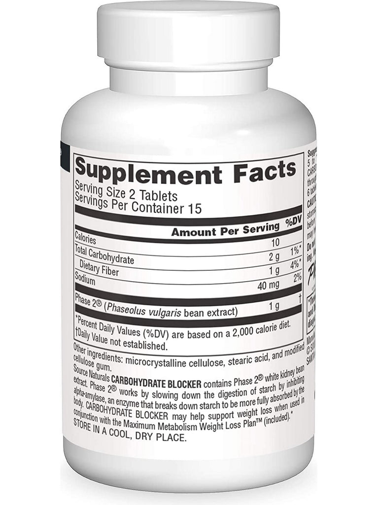 Source Naturals Carbohydrate Blocker contains Phase 2® white kidney bean extract. Phase 2® works by slowing down the digestion of starch by inhibiting alpha-amylase, an enzyme that breaks down starch to be more fully absorbed by the body. Carbohydrate Blocker may help support weight loss when used in conjunction with the Maximum Metabolism Weight Loss Plan™ (included).