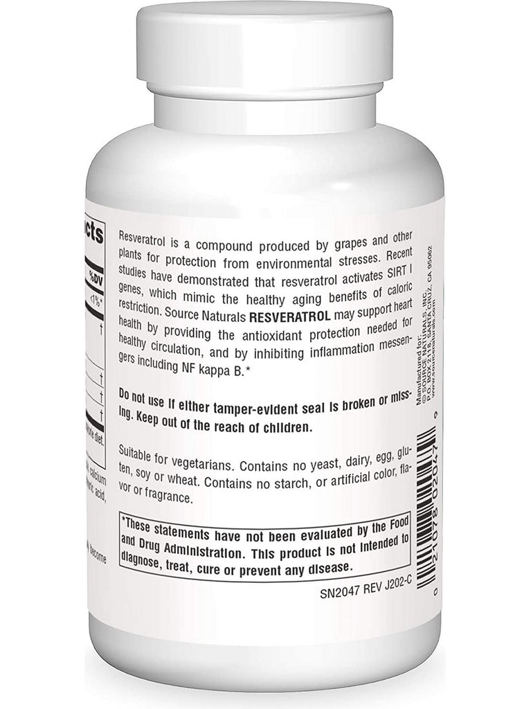 Resveratrol is a compound produced by grapes and other plants for protection from environmental stresses. Recent studies have demonstrated that resveratrol activates SIRT I genes, which mimic the healthy aging benefits of caloric restriction. Source Naturals Resveratrol may support heart health by providing the antioxidant protection needed for healthy circulation, and by inhibiting inflammation messengers including NF kappa B.
