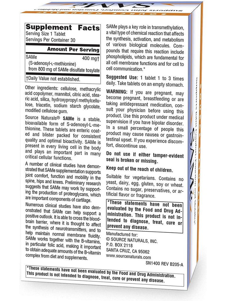 Source Naturals® SAMe is a stable, bioavailable form of S-adenosyl-L-methionine. These tablets are enteric coated and blister packed to prevent breakdown and inactivation of the ingredients.