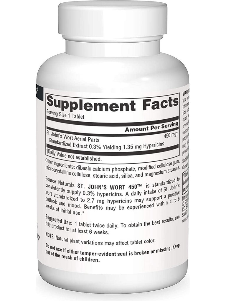Source Naturals St. John's Wort 450™ is standardized to consistently supply 0.3% hypericins. A daily intake of St. John’s wort standardized to 2.7 mg hypericins may support a positive outlook and mood. Benefits may be experienced within 4 to 6 weeks of initial use.