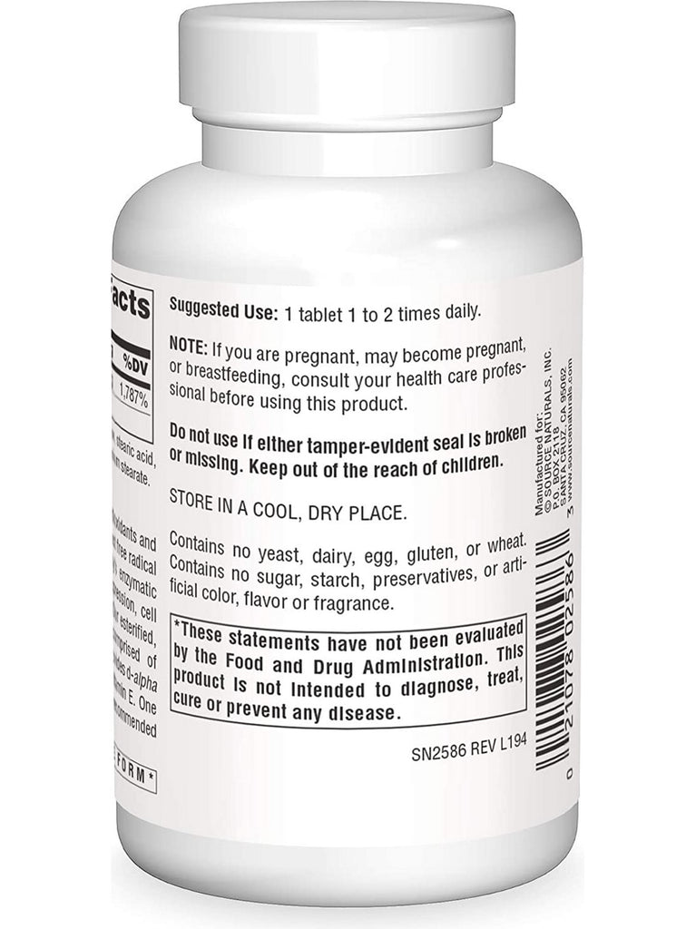 Vitamin E is one of the body’s chief antioxidants and may help protect the body’s cells against free radical damage. Vitamin E supports the body’s enzymatic activities and plays a role in gene expression, cell regulation, and neurological function. Our esterified, stabilized, non-GMO vitamin E is comprised of d-alpha tocopheryl succinate, which provides d-alpha tocopherol, the most active form of vitamin E. One tablet provides 1,787 percent of the recommended daily value.