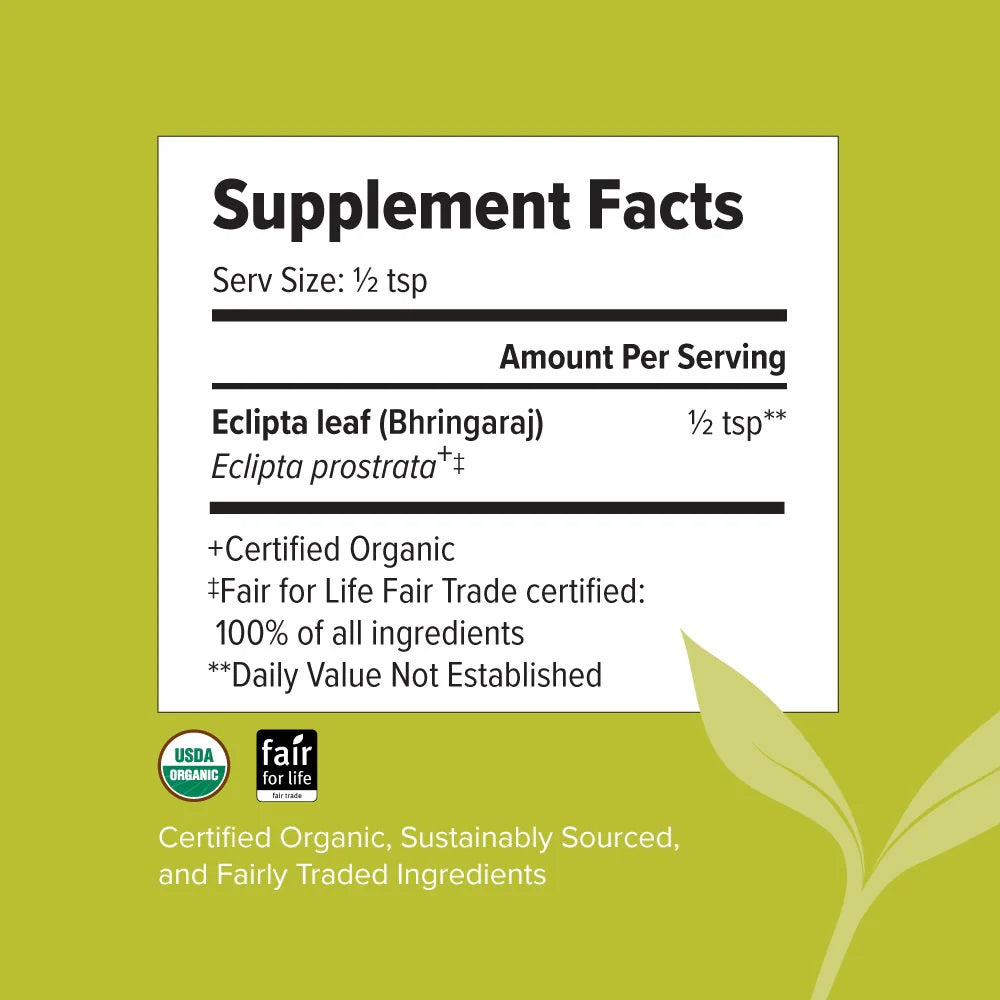 Bhringaraj (Eclipta alba) is famous in India for its use as a natural hair tonic. A primary ingredient in most Ayurvedic hair oils, bhringaraj promotes strong, healthy hair growth and helps maintain the hair's natural color and luster. It is one of the best rejuvenatives for pitta, and has a special affinity for the head. Bhringaraj promotes healthy nails, bones, teeth, and a clear complexion. It calms the mind, bolsters the memory, and supports healthy eyes and ears. Bhringaraj is also an excellent liver cleanser and supports proper function of the lungs.