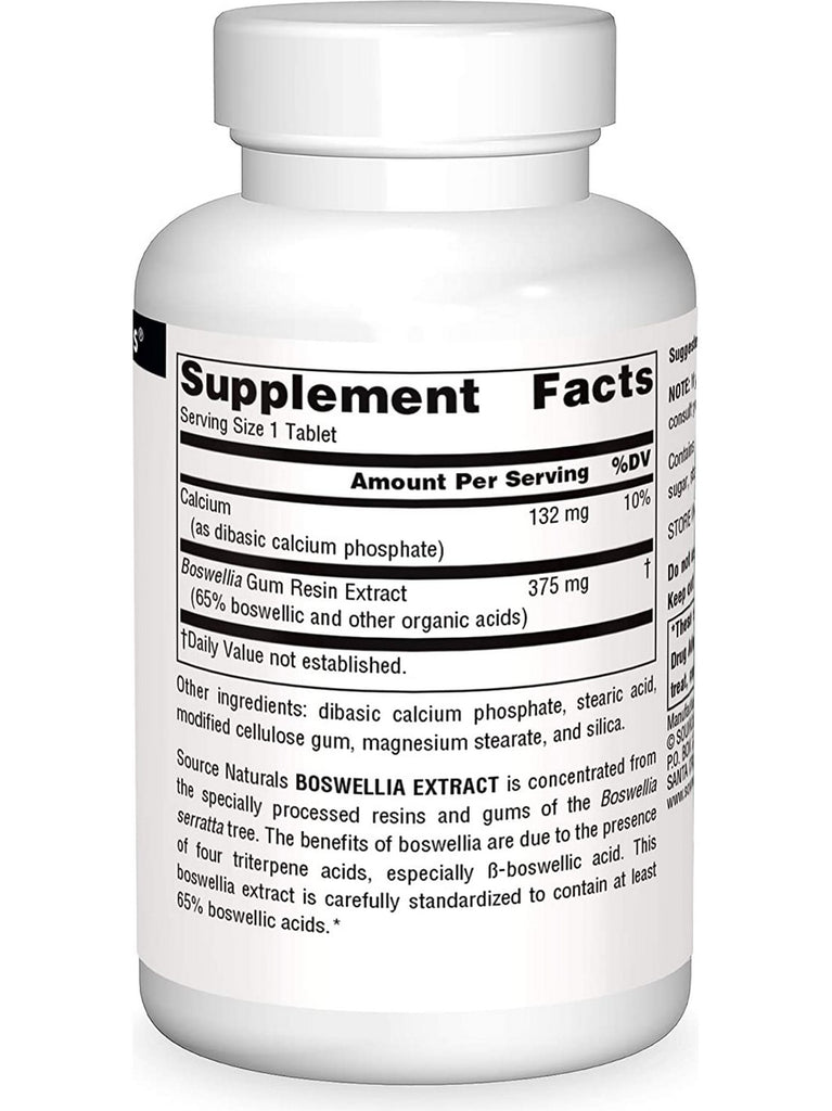 Source Naturals Boswellia Extract is concentrated from the specially processed resins and gums of the Boswellia serrata tree. The benefits of boswellia are due to the presence of four triterpene acids, especially ß-boswellic acid. This boswellia extract is carefully standardized to contain at least 65% boswellic acids.