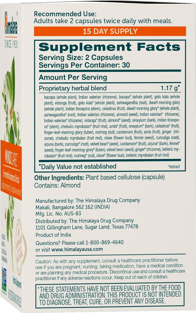 Proprietary herbal blend 1.17 g: bacopa (whole plant), gotu kola (whole plant), dwarf morning glory (whole plant), ashwagandha (root), jatamansi (rhizome), Indian valerian (rhizome), vidanga (fruit), almond (seed), Indian tinospora (stem), chebulic myrobalan (fruit rind), amla (fruit), oroxylum (bark), celastrus (fruit), curculigo (root), velvet bean (seed), cardamom (fruit), arjuna (bark), fennel (seed), finger-leaf morning glory (tuber), ginger (rhizome), belleric myrobalan (fruit rind), nutmeg (nut), clove (flower bud). Other Ingredients: Vegetable Cellulose (Capsules) Contains: Almond.