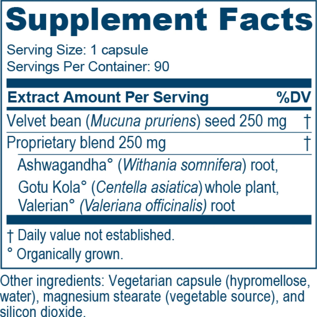 Standardized extracts of: Mucuna Prurens...250mg Proprietary Blend totaling 250 mg of the following: (Centella asiatica, V offic, Withania somnifera)