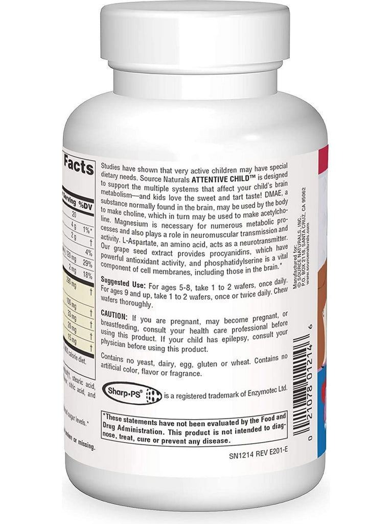Studies have shown that very active children may have special dietary needs. Source Naturals Attentive Child™ is designed to support the multiple systems that affect your child's brain metabolism-and kids love the sweet and tart taste! DMAE, a substance normally found in the brain, may be used by the body to make choline, which in turn may be used to make acetylcholine. Magnesium is necessary for numerous metabolic processes and also plays a role in neuromuscular transmission and activity. L-Aspartate, an amino acid, acts as a neurotransmitter. Our grape seed extract provides procyanidins, which have powerful antioxidant activity, and phosphatidylserine is a vital component of cell membranes, including those in the brain.