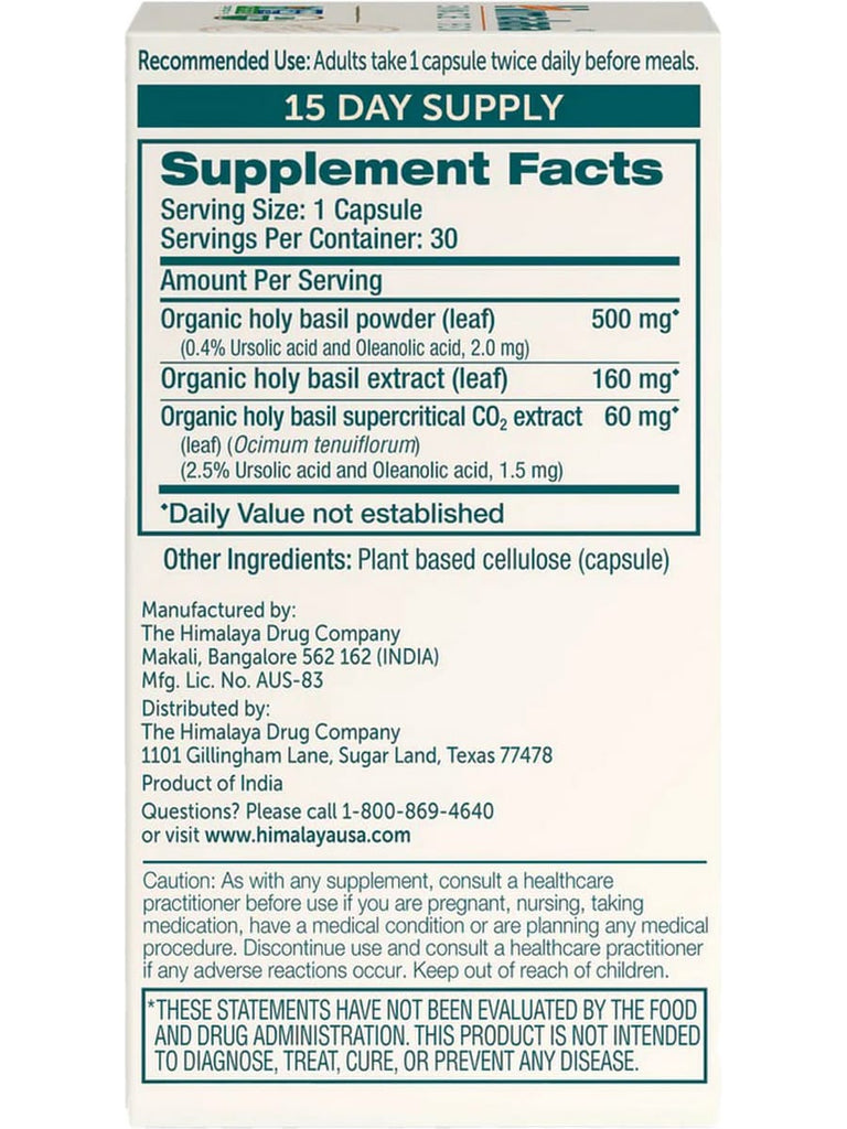 In Ayurveda, Holy Basil is considered sacred and special, and is often found in temple gardens to promote peaceful thoughts. Himalaya Holy Basil uses a combination of Holy Basil leaf powder, Holy Basil leaf extract and Holy Basil supercritical C02 leaf extract instead of just the simple crushed Holy Basil you may find on its own in other supplements.