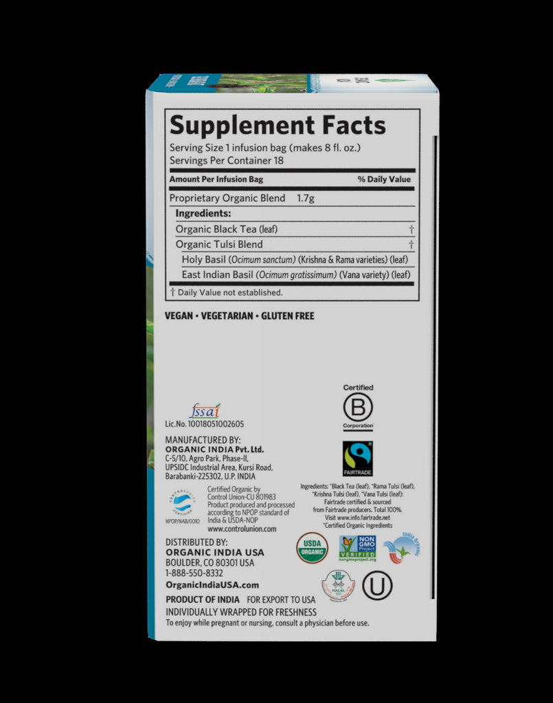 Formerly known as India Breakfast Tea. Deep, spicy, and revitalizing, organic Tulsi Breakfast combines Tulsi and robust Black Teas for a full, hearty infusion.