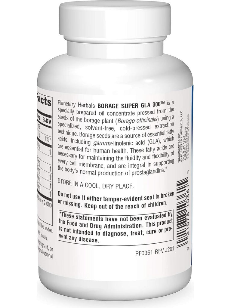 Planetary Herbals Borage Super GLA 300 is a specially prepared oil concentrate pressed from the seeds of the borage plant (Borago officinalis), using a specialized, solvent-free, cold-pressed extraction technique. Borage seeds are a rich source of essential fatty acids, including gamma-linolenic acid (GLA), which are essential for human health. These fatty acids are necessary for maintaining the fluidity and flexibility of every cell membrane, and are integral in supporting the body's normal production of prostaglandins.