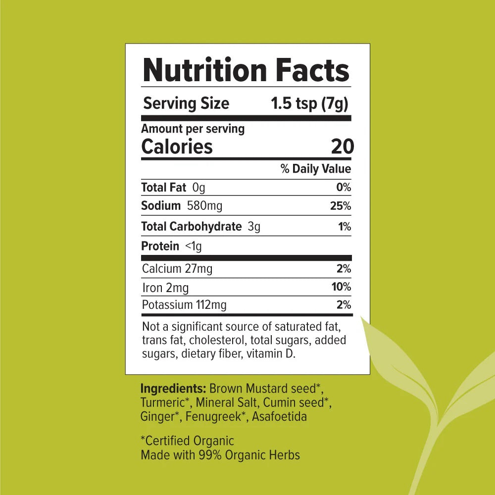 Brown Mustard seed, Turmeric powder, Natural Mineral salt, Cumin seed, Ginger powder, Asafoetida, Fenugreek.