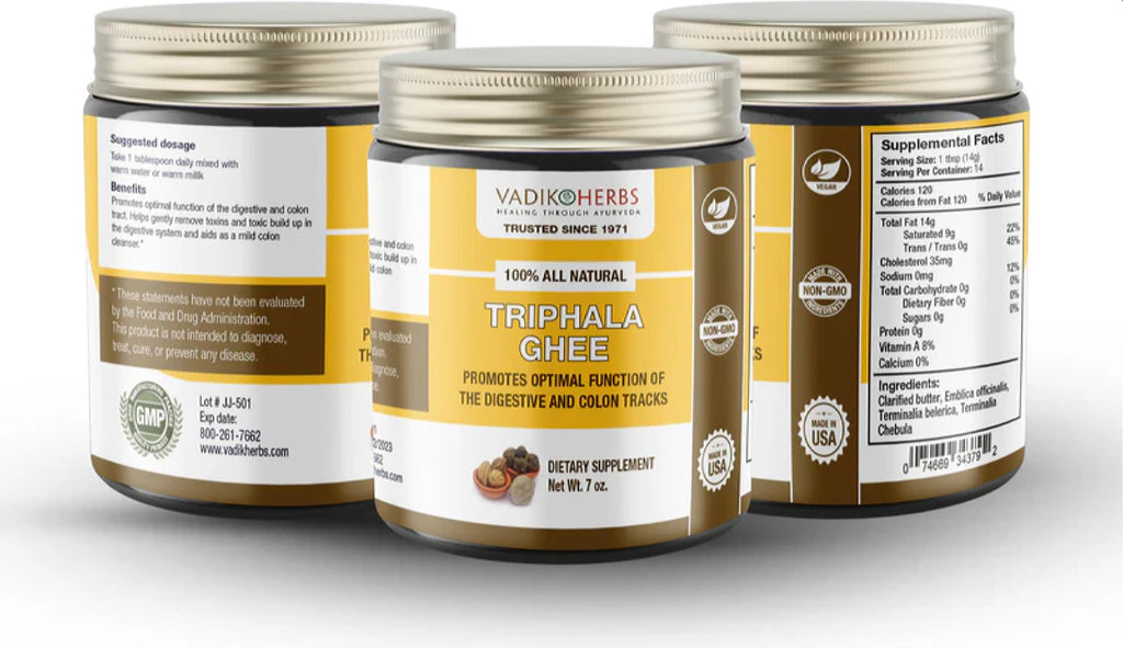 Triphala ghee is a traditional Ayurvedic preparation made by combining ghee (clarified butter) with Triphala, which is a herbal blend consisting of three fruits: Amla (Indian gooseberry), Haritaki, and Bibhitaki. This combination is highly regarded in Ayurveda for its potential health benefits.
