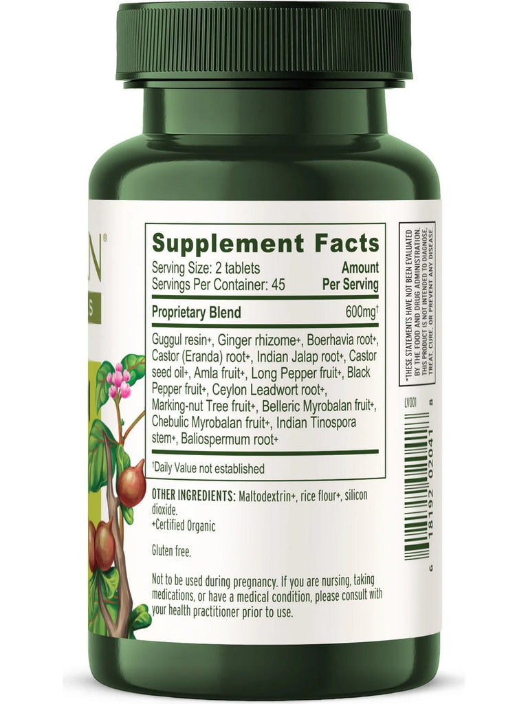 Each 300 mg tablet contains: Punarnava root (Boerhaavia diffusa), Guggulu resin (Commiphora mukul), Eranda root (Ricinus communis), Nishoth root (Operculina turpethum), Ginger root (Zingiber officinale), Guduchi herb (Tinospora cordifolia), Danti root (Baliospermum montanum), Amalaki fruit (Emblica officinalis), Bibhitaki fruit (Terminalia belerica), Haritaki fruit (Terminalia chebula), Pippali fruit (Piper longum), Black Pepper fruit (Piper nigrum), Chitrak root (Plumbago zeylanica), Bhallataka herb (Semecarpus anacardium), rock salt.