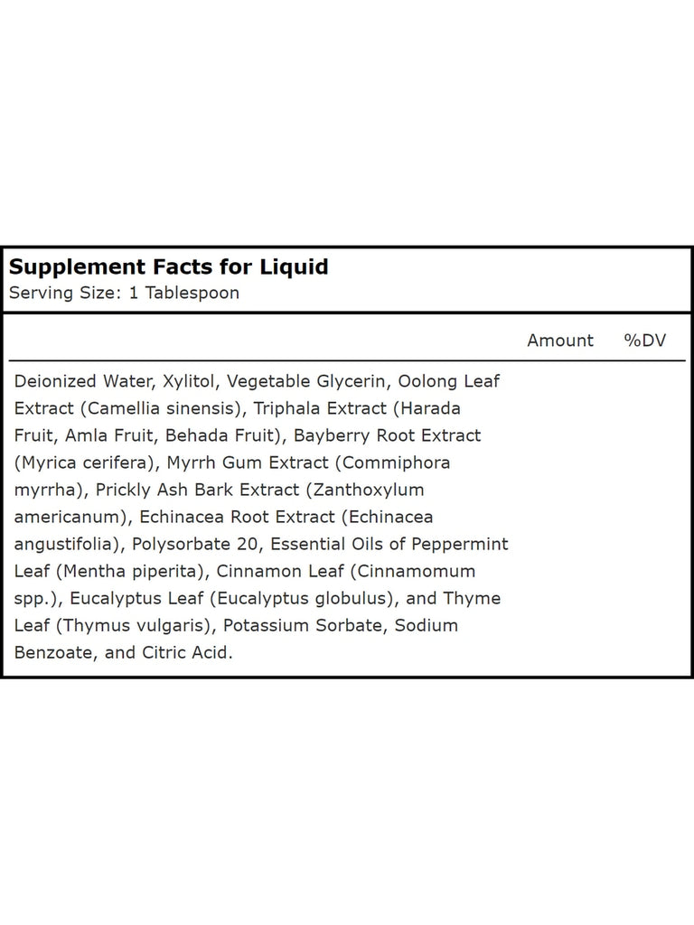 Triphala Mouthwash is formulated with traditional botanicals and essential oils to freshen the breath. Triphala is a traditional Ayurvedic formulation consisting of three fruits: amla, harada, and behada. Triphala Mouthwash is sweetened with xylitol, which does not promote tooth decay.