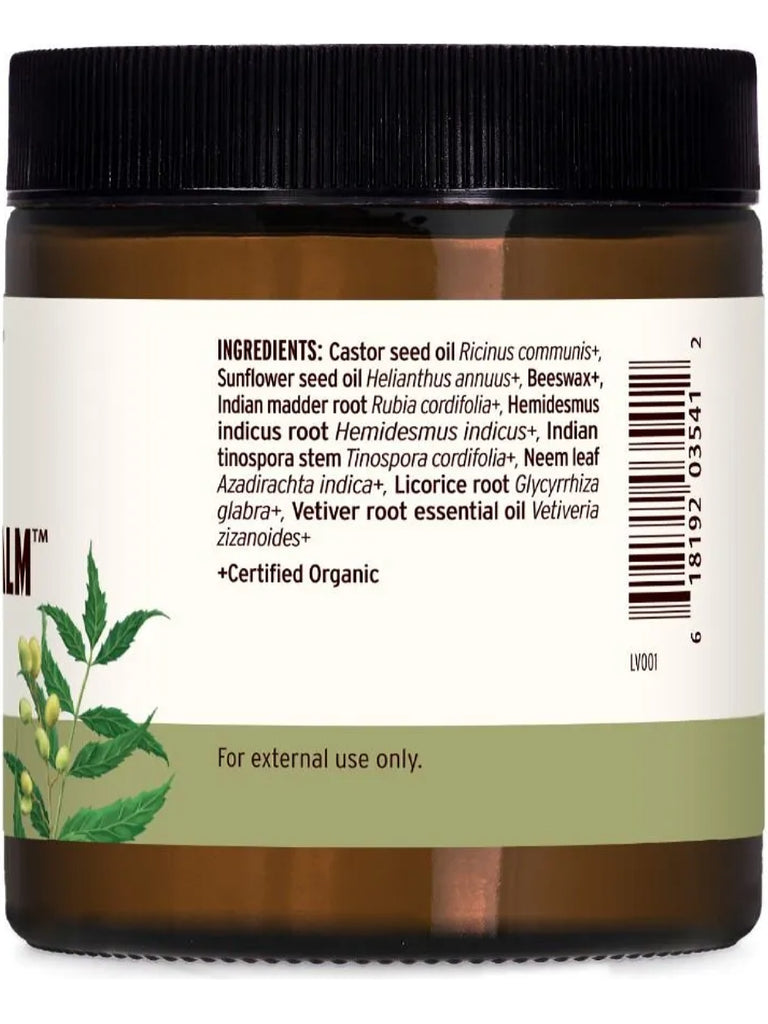 Each 4oz jar contains: Castor Oil**, Sunflower Oil**, Beeswax**, Manjista root (Rubia cordifolia)**, Anantamul root (Hemidesmus indicus)**, Guduchi stem (Tinospora cordifolia)**, Neem leaf (Azadirachta indica)**, Licorice root (Glycyrrhiza glabra)**, Vetiver essential oil.**