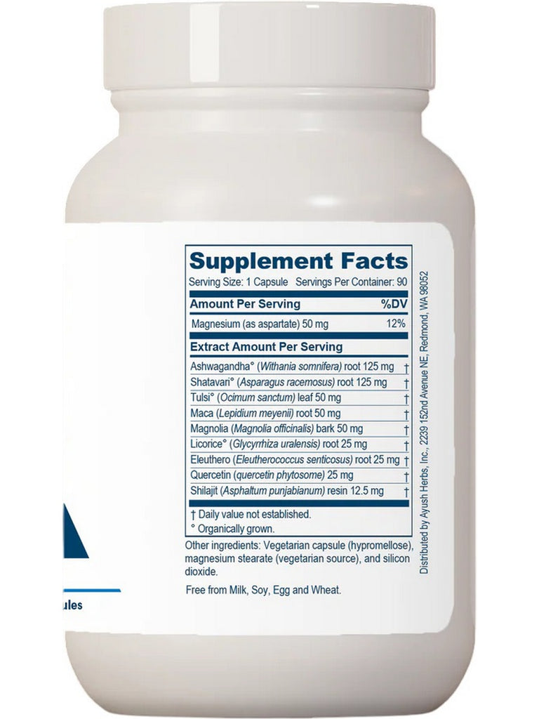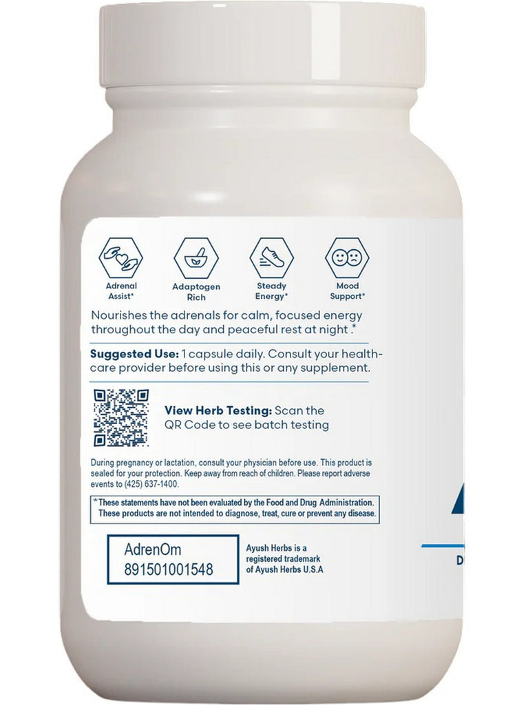 Ayush Herbs AdrenOm™ is a unique adrenal health supplement that focuses on all aspects of balancing adrenal health and support for periods of high stress. It achieves this balance by employing energizing herbs such as Maca, Shilajit, and Rhodiola and combining them with relaxing herbs such as Ashwagandha, Magnolia, Shatavari, and Tulsi. Additionally, key nutrients Magnesium and phytosomal Quercetin nourish the adrenal glands and promote a calm and focused attention. The result is a supplement that helps provide the extra energy and focus desired while simultaneously nourishing the adrenal glands and promoting a sense of calm and focus.