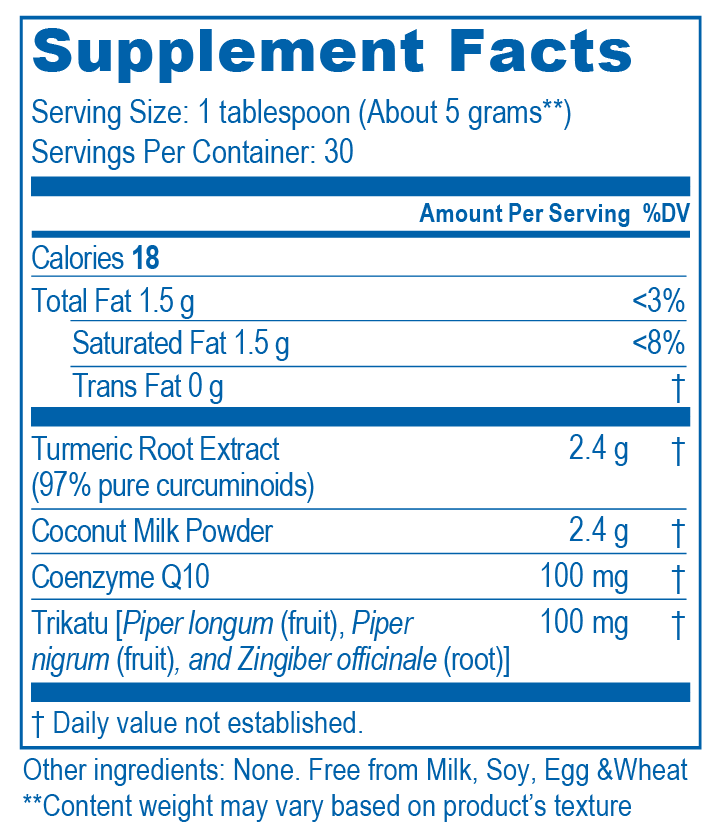 Curcumin absorption may be greatly enhanced when it is consumed with fats or food that contain fats. Adding medium-chain triglycerides (MCTs), as we have done in our formula, to Curcumin preparations can enhance the bio-availability of Curcumin. MCTs are a unique form of dietary fat that impart a wide range of positive health benefits. MCTs have proven useful in supporting fat metabolism.