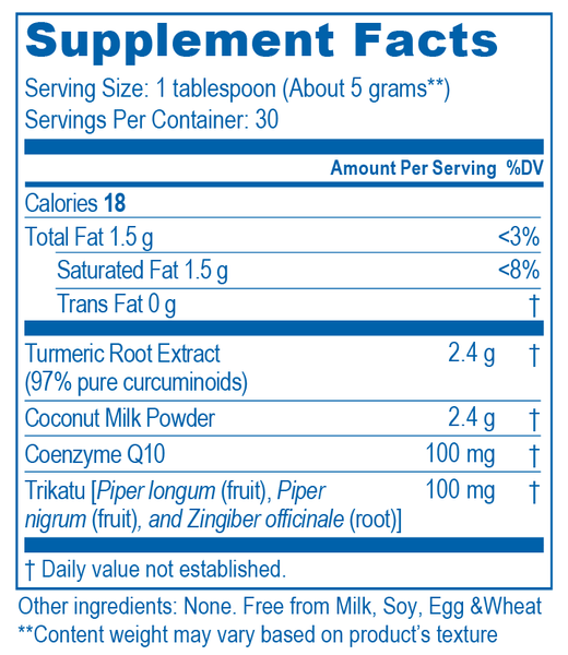 In addition, we have added 100 mg of Coenzyme Q10 (CoQ10) for greater benefits. CoQ10 is a naturally-occurring compound found in the energy-producing center of the cell known as the mitochondria, and is necessary for the basic functioning of cells. CoQ10 levels are reported to decrease with age. Usual supplementation with CoQ10 does not increase in tissue levels, as it depends a lot on the fat membrane. The MCT in our formula will also enhance the bioavailability of CoQ10, as well as curcumin. In order to significantly increase the tissue concentration of CoQ10, and also increase its concentration in the blood around 2 g/mL, at least 100 mg per day is required. CoQ10 is used for cell signaling and gene expression, helps support the immune system and is essential for healthy heart function. It also possesses antioxidant properties.