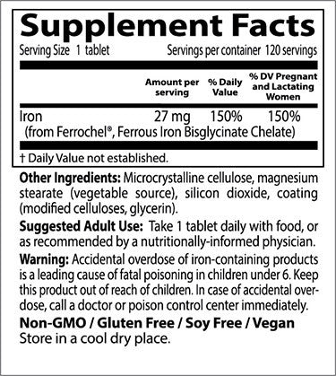 Doctor's Best High Absorption Iron with Ferrochel is chelated to help increase bioavailability, and prevent the nausea and digestive discomfort commonly cause by Iron supplementation. Chelation allows Iron to pass easily through the intestinal wall, where minerals are optimally absorbed. Iron is an essential mineral that helps in the production of normal red blood cells. It is an important component of hemoglobin which carries oxygen throughout the body. Iron plays an important role in the metabolism of folic acid, which is important for fetal nervous system development. Anemia in pregnant women has been linked to low birth weight and premature birth. The most common cause of anemia is iron deficiency. Ferrochel Iron is chelated with bisglycinate amino acids, providing high absorption and increased tolerability.