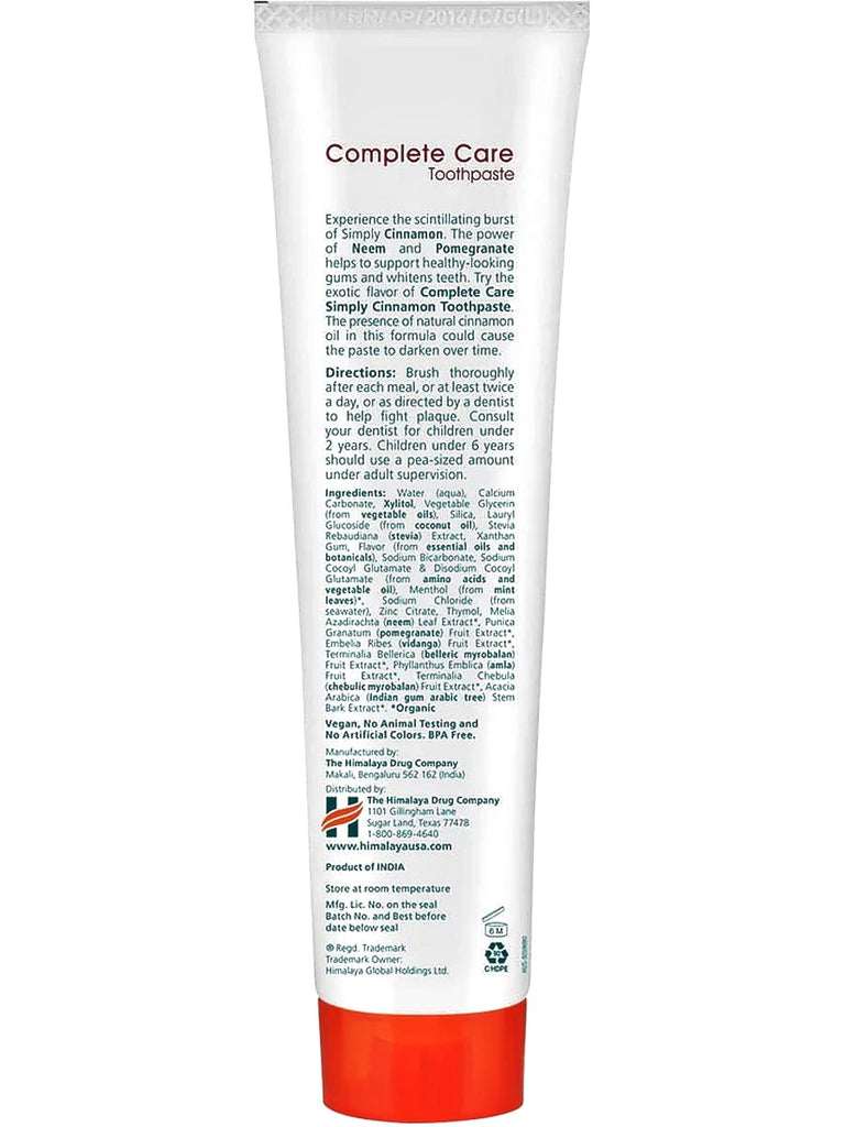Himalaya uses gentle ingredients without all the extras like Fluoride, Triclosan, SLS or gluten, and it still tastes and foams wonderfully. Our Complete Care Simply Cinnamon Toothpaste leverages the cleaning properties of Neem and Pomegranate for cleaner teeth and healthy-looking gums to promote fresher, brighter smiles.