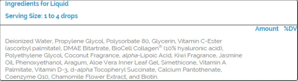 Deionized Water, Propylene Glycol, Polysorbate 80, Glycerin, Vitamin C-Ester (Ascorbyl Palmitate), DMAE, Biocell Collagen II (10% Hyaluronic Acid), Polyethelene Glycol, Coconut Fragrance, Jasmine Fragrance, alpha-lipoic Acid, Kiwi Fragrance, Aloe Vera Leaf, Biotin, Vitamin A, Vitamin D-3, Coenzyme Q10, Vitamin E, Calcium Pantothenate, Chamomile Flower Extract (4:1), Simethicone, Phenoxyethanol, and Aragum. -