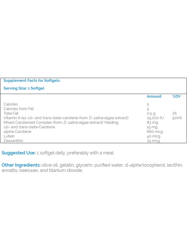 Source Naturals Full Spectrum™ Carotene, from Dunaliella salina algae, helps support eye health. It is an excellent source of pro-vitamin A, providing 500% DV as a blend of cis- and trans-beta-carotene, which is converted in the body to the active form of vitamin A as needed. The broad spectrum of carotenoids in Full Spectrum™ Carotene act as antioxidants. Vitamin A is an essential nutrient required for healthy skin, eyes, mucous membranes, cell growth and immune defense.