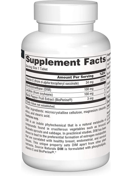DIM is an indole phytochemical that is a natural metabolite of compounds found in cruciferous vegetables such as broccoli, Brussels sprouts and cabbage. In preclinical studies, DIM has been shown to lead to the preferential formation of estrogen metabolites that are correlated with healthy breast, endometrial, and cervical tissues. This unique property sets DIM apart from other plant nutrients. Source Naturals DIM is formulated with phospholipids, vitamin E and BioPerine®.