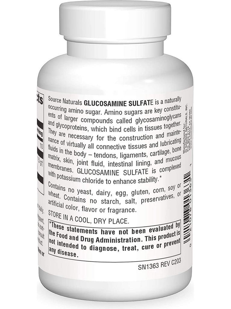 Source Naturals GLUCOSAMINE SULFATE is a naturally occurring amino sugar. Amino sugars are key constituents of larger compounds called glycosaminoglycans and glycoproteins, which bind cells in tissues together. They are necessary for the construction and maintenance of virtually all connective tissues and lubricating fluids in the body – tendons, ligaments, cartilage, bone matrix, skin, joint fluid, intestinal lining, and mucous membranes. GLUCOSAMINE SULFATE is complexed with potassium chloride to enhance stability.