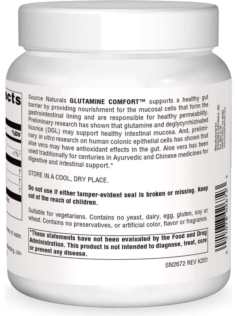 Source Naturals Glutamine Comfort™ supports a healthy gut barrier by providing nourishment for the mucosal cells that form the gastrointestinal lining and are responsible for healthy permeability. Preliminary research has shown that glutamine and deglycyrrhizinated licorice (DGL) may support healthy intestinal mucosa. And, preliminary in vitro research on human colonic epithelial cells has shown that aloe vera may have antioxidant effects in the gut. Aloe vera has been used traditionally for centuries in Ayurvedic and Chinese medicines for digestive and intestinal support.