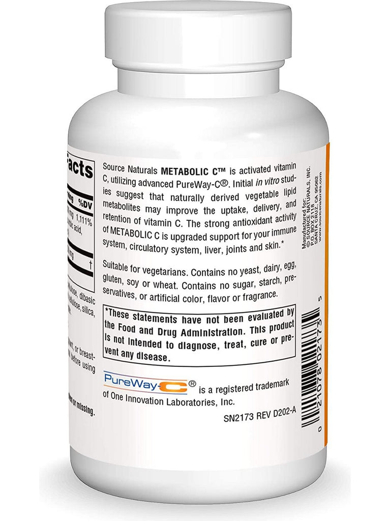 Source Naturals METABOLIC C™ is activated vitamin C, utilizing advanced PureWay-C™. Initial in vitro studies suggest that naturally derived vegetable lipid metabolites may improve the uptake, delivery, and retention of vitamin C. The strong antioxidant activity of METABOLIC C is upgraded support for your immune system, circulatory system, liver, joints and skin.